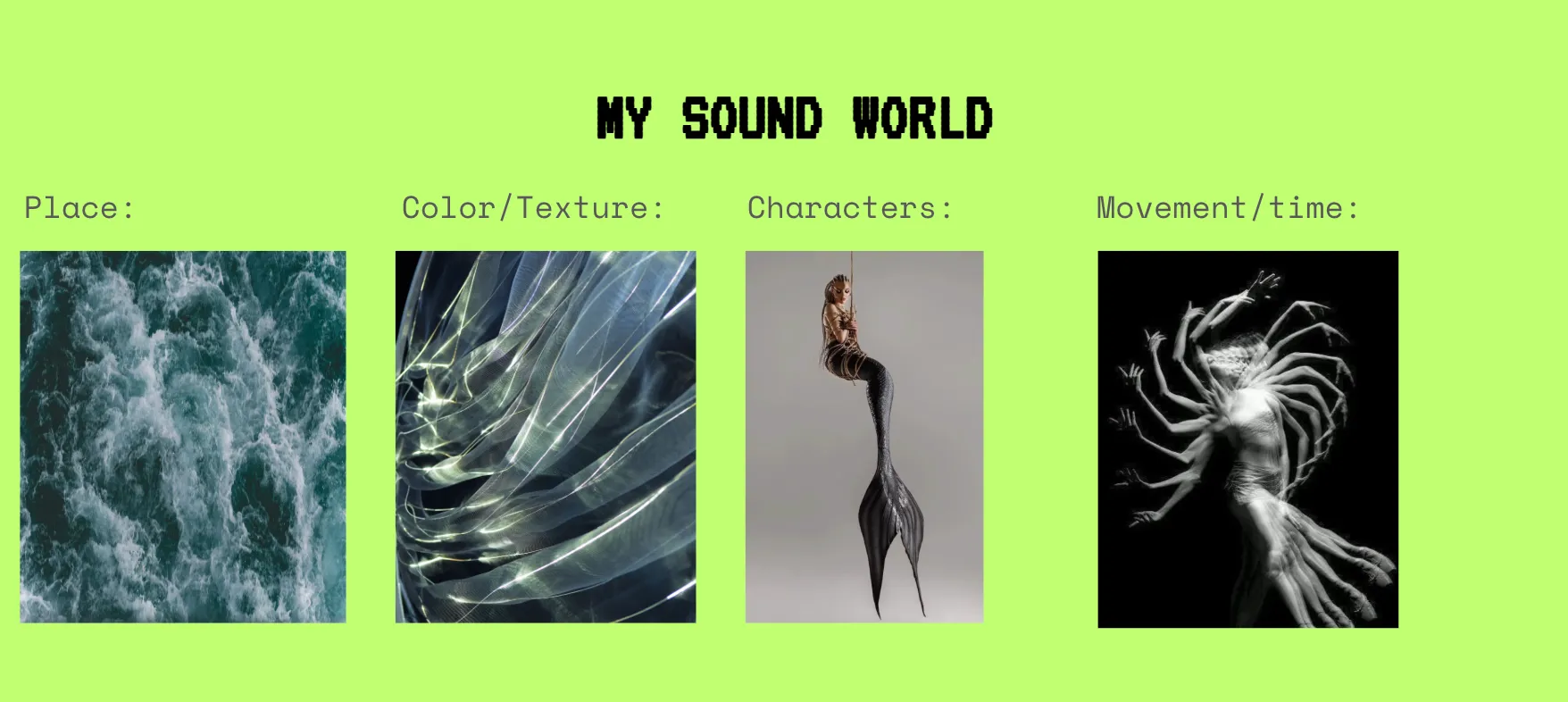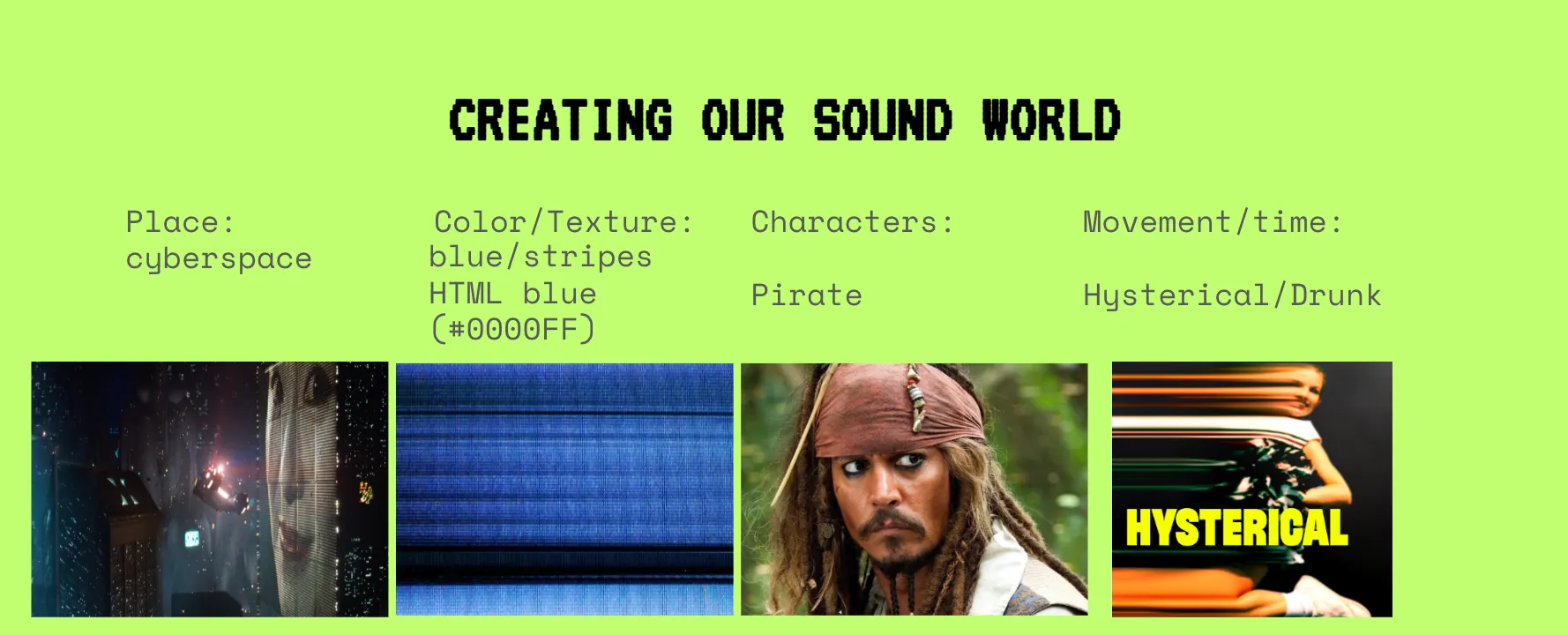 Built on random inputs, the workshop participants chose a conceptual world to collaboratively compose a cyberspace pirate world with blue/striped textures, hysterical/drunk movement, and pirate characters—providing the conceptual foundation for our sound creation.